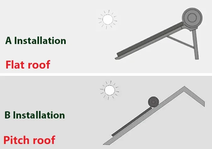 The solar water heater can be installed for both flat roof and pitch roof: