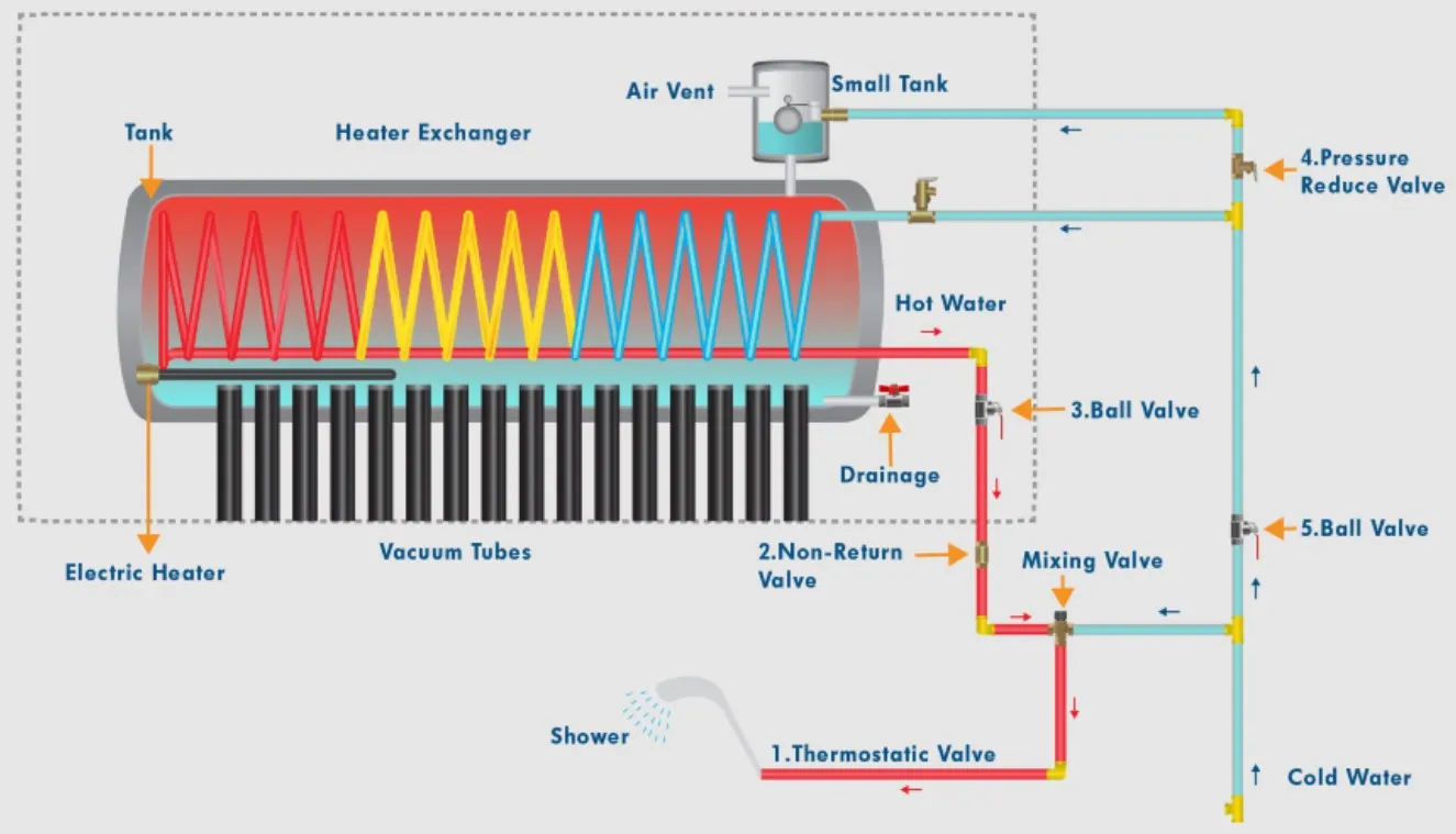 Sistema di riscaldamento dell’acqua solare pressurizzato da 250 litri con tubo di aspirazione dello scambiatore a serpentina in rame per uso domestico o commerciale